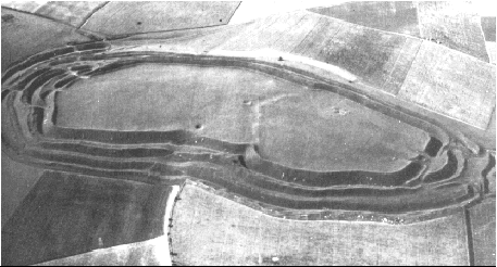 The Celtic hill fort Maiden Castle, seen from the air, reveals successive stages of